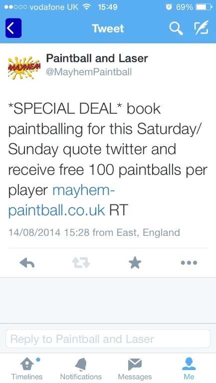 Give us a call in the office to book and quote twitter deal you will receive an extra 100 paintballs per player !